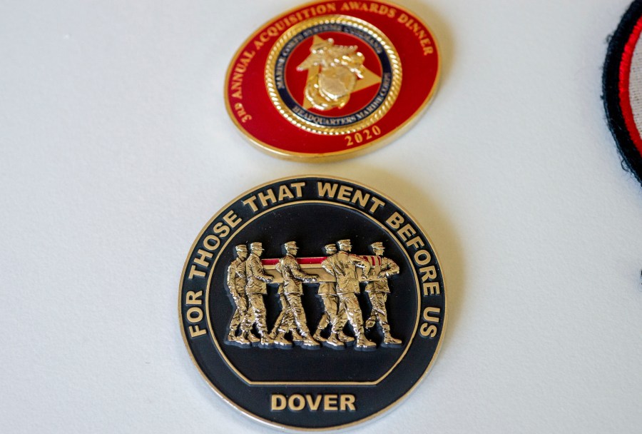 “Challenge coins” belonging to Marine Corporal Spencer R. Collart, are seen at the home of his parents in Arlington, Va., Thursday, June 19, 2024. Collart, 21, was killed along with two other Marines when the MV-22B Osprey aircraft they were on crashed during drills on a north Australian island on Aug. 27, 2023. (AP Photo/Rod Lamkey, Jr.)