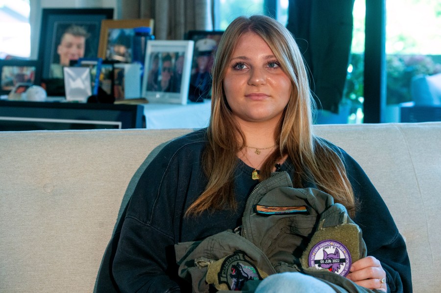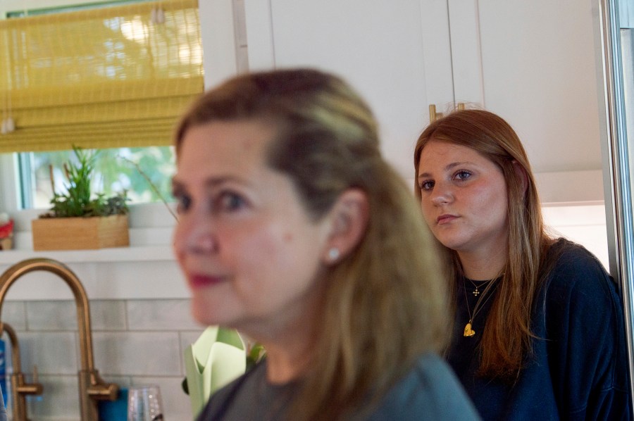 Alexia Collart, left, and her daughter Gwyneth, right, talk about her son, Marine Corporal Spencer R. Collart, in their home, in Arlington, Va., Thursday, June 19, 2024. Collart, 21, was killed along with two other Marines when the MV-22B Osprey aircraft they were on crashed during drills on a north Australian island on Aug. 27, 2023. (AP Photo/Rod Lamkey, Jr.)