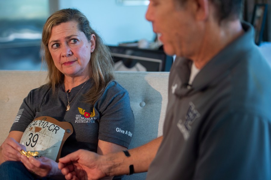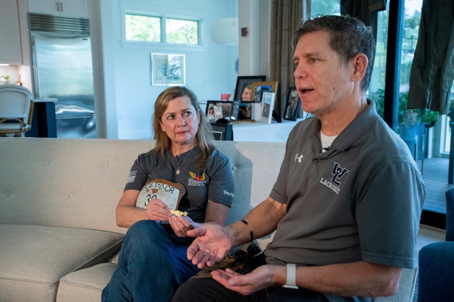 Bart Collart, left, and his wife Alexia Collart talk about their son, Marine Corporal Spencer R. Collart, at their home, in Arlington, Va., Thursday, June 19, 2024. Collart, 21, was killed along with two other Marines when the MV-22B Osprey aircraft they were on crashed during drills on a north Australian island on Aug. 27, 2023. (AP Photo/Rod Lamkey, Jr.)