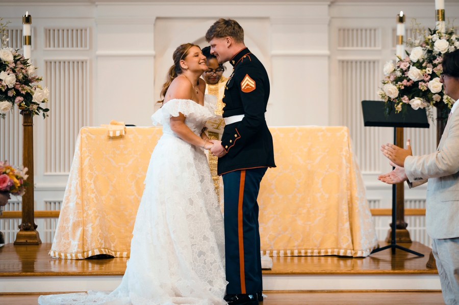 This image provided by Tell It Well Photography shows Gwyneth Collart, left, and Cpl. Jonah Waser at the alter during their wedding, July 6, 2024, in Arlington, Va. Collart is the sister of the late Marine Corporal Spencer R. Collart, who was killed along with two other Marines when the MV-22B Osprey aircraft they were on crashed during drills on a north Australian island on Aug. 27, 2023. (Tell It Well Photography via AP)