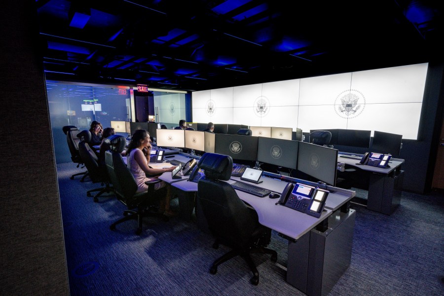 It has a reception area with a U.S. seal in stonework. Behind that is the main conference room, known as the “JFK room.” To the right are a smaller conference room and two soundproof “breakout rooms.” To the left is the “watch floor,” a 24-7 operations center.