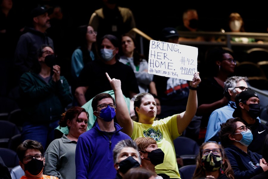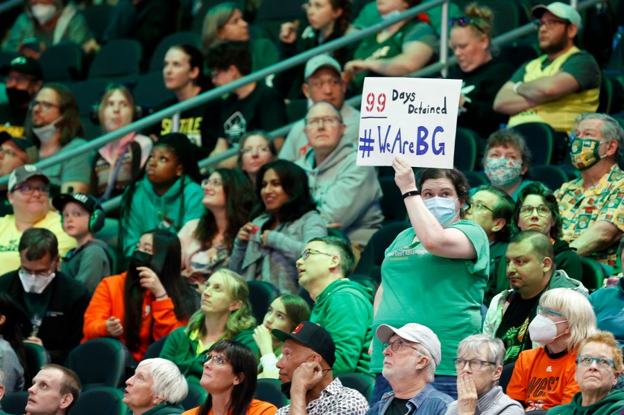 SEATTLE, WASHINGTON – MAY 27: A fan holds a sign for Brittney Griner, who has been detained in Russia for 99 days since February 17, during the third quarter between the Seattle Storm and the New York Liberty at Climate Pledge Arena on May 27, 2022 in Seattle, Washington. NOTE TO USER: User expressly acknowledges and agrees that, by downloading and or using this photograph, User is consenting to the terms and conditions of the Getty Images License Agreement (Photo by Steph Chambers/Getty Images)
