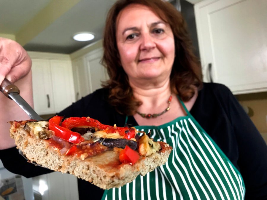 Tiziana di Costanzo, co-founder of Horizon Insects, holds up a slice of pizza made with cricket powder, in her London kitchen on June 2, 2021. While insects are commonly eaten in parts of Asia and Africa, they’re increasingly seen as a viable food source in the West as Earth’s growing population puts more pressure on global food production. Experts say they’re rich in protein, yet can be raised much more sustainably than beef or pork. Regulatory change has also made things easier for European companies looking to market insects directly to consumers. (AP Photo/Kelvin Chan)