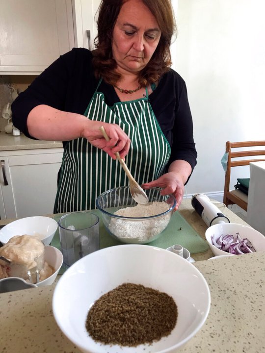 Tiziana di Costanzo, co-founder of Horizon Insects, stirs flour for pizza dough before adding cricket powder, pictured in foreground, in her London kitchen on June 2, 2021. While insects are commonly eaten in parts of Asia and Africa, they’re increasingly seen as a viable food source in the West as Earth’s growing population puts more pressure on global food production. Experts say they’re rich in protein, yet can be raised much more sustainably than beef or pork. Regulatory change has also made things easier for European companies looking to market insects directly to consumers. (AP Photo/Kelvin Chan)