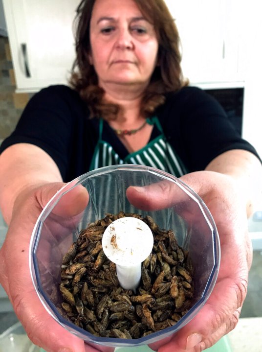 Tiziana di Costanzo, co-founder of Horizon Insects, holds up a cup of dried crickets to be ground up and added to pizza dough, in her London kitchen on June 2, 2021. While insects are commonly eaten in parts of Asia and Africa, they’re increasingly seen as a viable food source in the West as Earth’s growing population puts more pressure on global food production. Experts say they’re rich in protein, yet can be raised much more sustainably than beef or pork. Regulatory change has also made things easier for European companies looking to market insects directly to consumers. (AP Photo/Kelvin Chan)