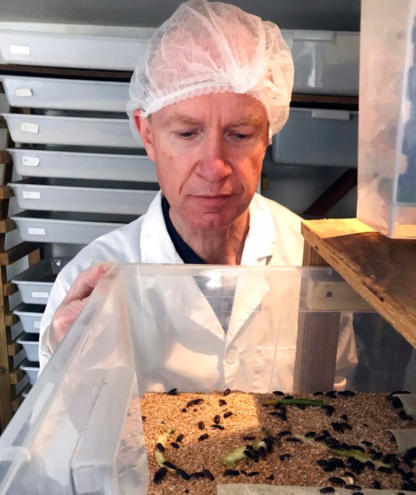 Tom Mohan, co-founder of Horizon Insects, examines a tray of Tenebrio molitor beetles at the company’s London insect farm on June 2, 2021. While insects are commonly eaten in parts of Asia and Africa, they’re increasingly seen as a viable food source in the West as Earth’s growing population puts more pressure on global food production. Experts say they’re rich in protein, yet can be raised much more sustainably than beef or pork. Regulatory change has also made things easier for European companies looking to market insects directly to consumers. (AP Photo/Kelvin Chan)