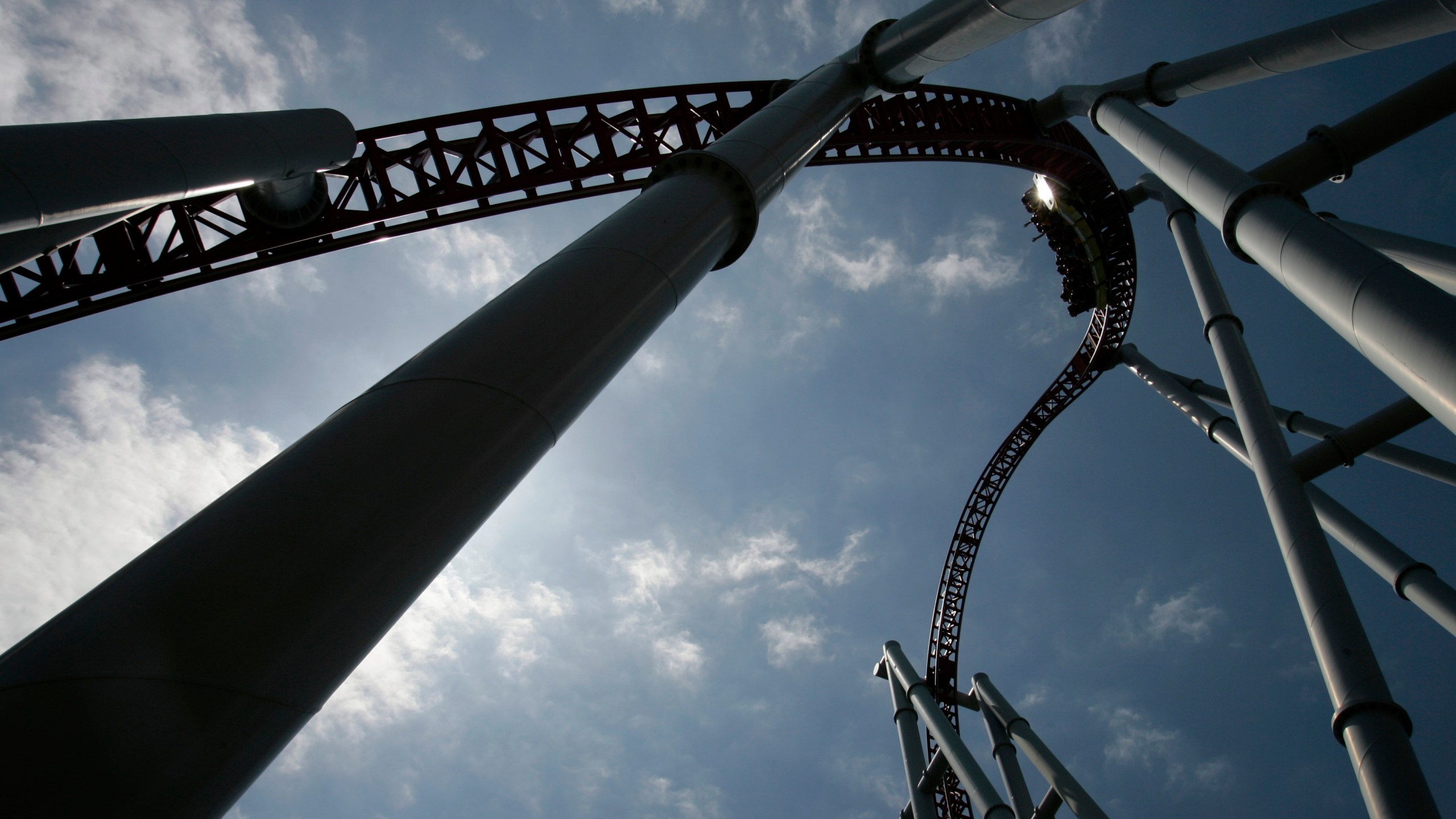 ** FOR IMMEDIATE RELEASE **Cars on the Storm Runner roller coaster fly overhead at Hersheypark in Hershey, Pa., Saturday, May 5, 2007. Hersheypark is celebrating 100 years of operation. (AP Photo/Carolyn Kaster)