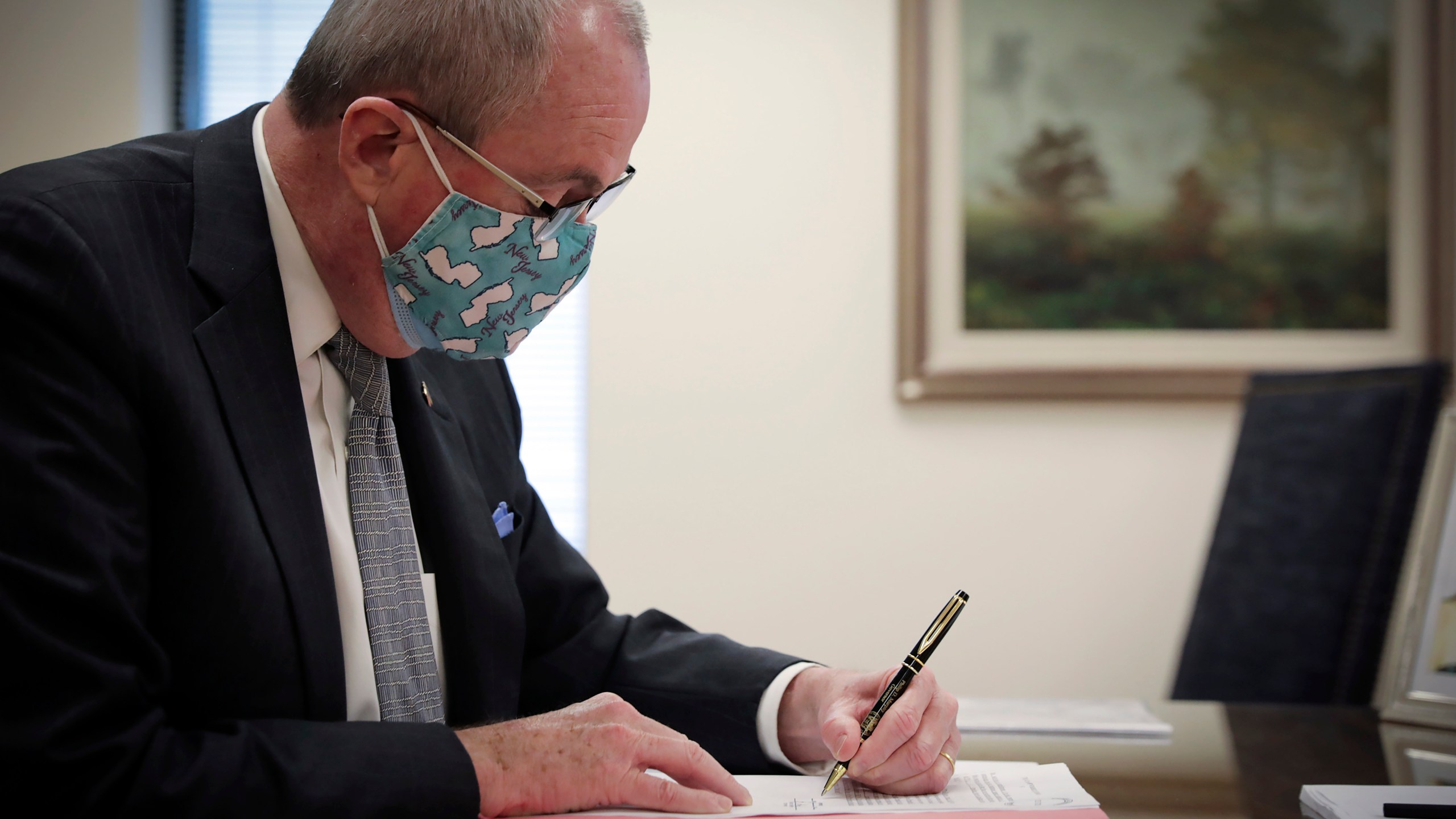 This photo provided by the New Jersey Governor’s Office shows Gov. Phil Murphy as he signs into law legislation to set up a recreational marijuana marketplace, Monday, Feb. 22, 2021, in Trenton, N.J. A recreational marijuana marketplace, cannabis decriminalization and looser penalties for underage possession of the drug and alcohol became law in New Jersey, more than three months after voters overwhelmingly approved a ballot question to legalize adult use of the drug. (Edwin J. Torres/New Jersey Governor’s Office via AP)