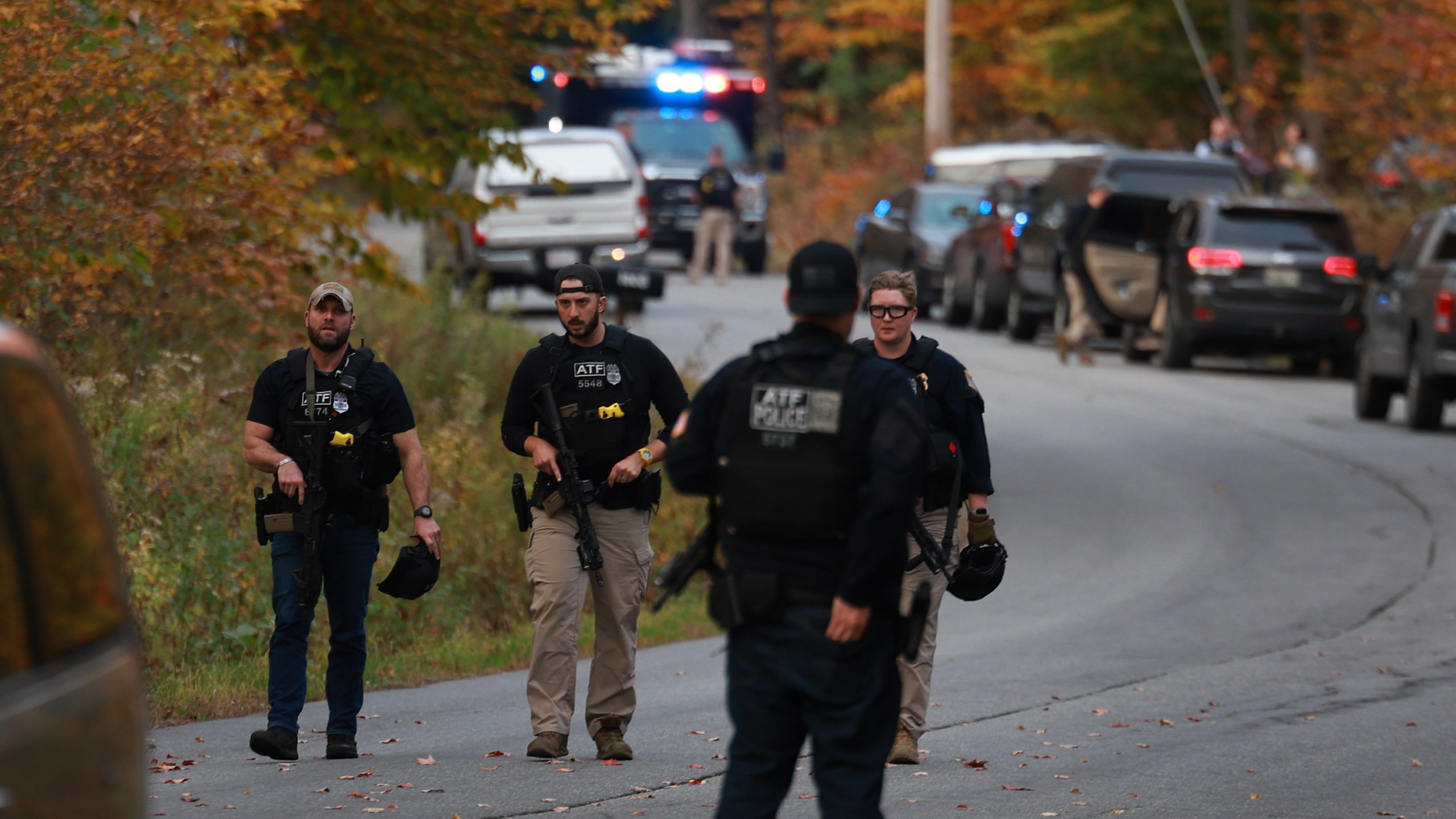 BOWDOIN, MAINE – OCTOBER 26: Law enforcement officials gather in the road leading to the home of the suspect being sought in connection with two mass shootings on October 26, 2023 in Bowdoin, Maine. Police are searching for U.S. Army Reservist Robert Card, 40, who is wanted in the shooting deaths of 18 people at a bowling alley and a bar last night in nearby Lewiston. At least 13 others were wounded in the rampage. (Photo by Joe Raedle/Getty Images)