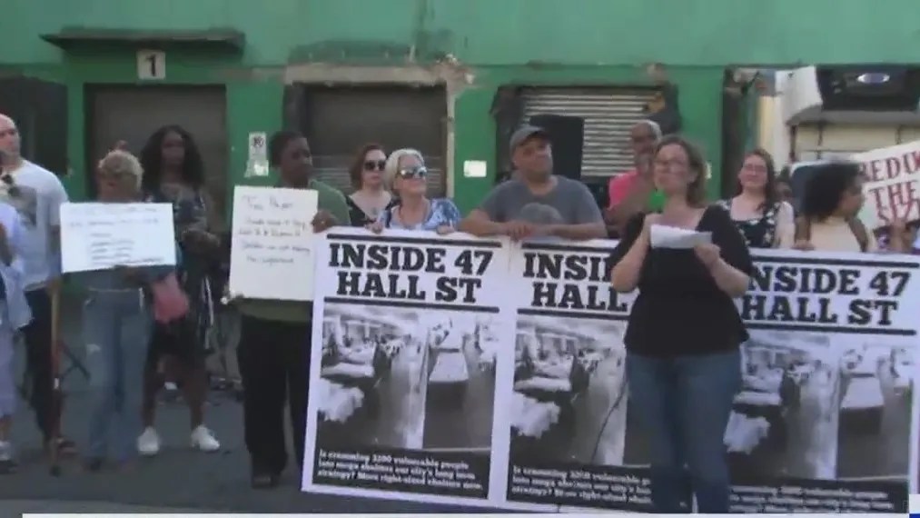 The migrant shelter at 47 Hall St. has become a focal point of contention for neighbors who said the influx of more than 3,200 asylum seekers living at the site is overwhelming the neighborhood.