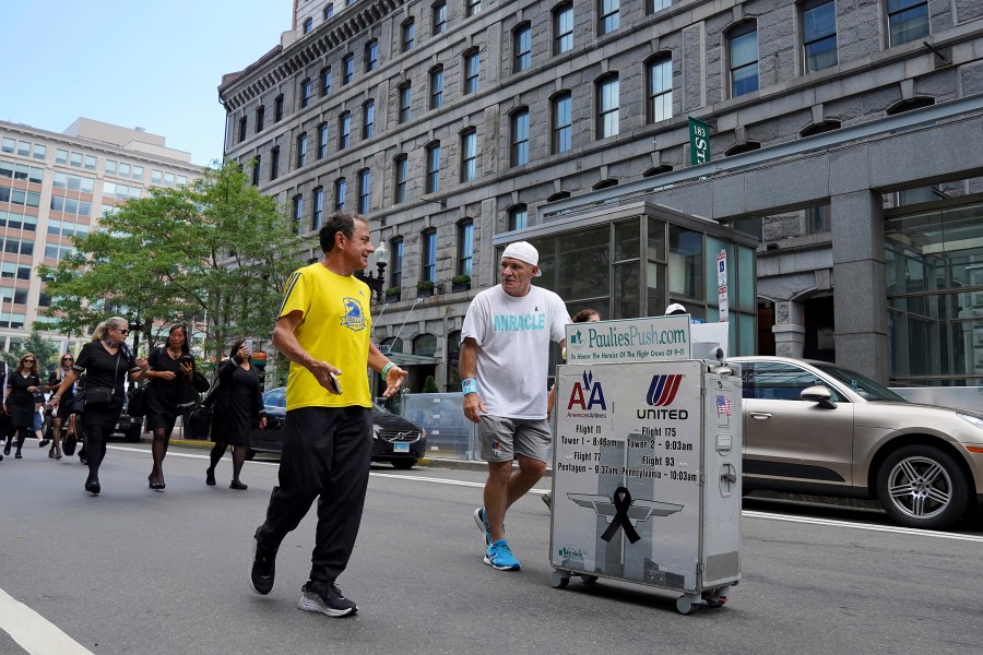 NATICK, Mass. (AP) — The retired flight attendant pushing an airline beverage cart more than 200 miles from Boston to New York City to honor colleagues who died during the Sept. 11, 2001 terrorist attacks is well on his way.