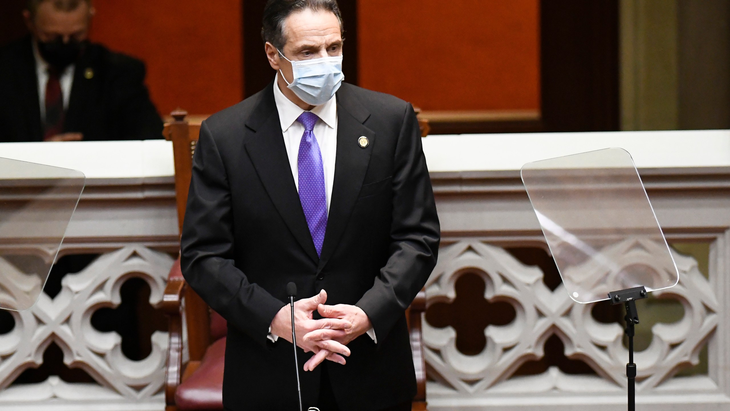New York Governor Andrew Cuomo speaks to members of New York state’s Electoral College before voting for President and Vice President in the Assembly Chamber at the state Capitol in Albany, New York on December 14, 2020. – Joe Biden’s march to the White House — overshadowed by President Donald Trump’s frantic attempts to overturn the US election — is to be formalized when the Electoral College meets to confirm the Democrat’s win. (Photo by Hans Pennink / POOL / AFP) (Photo by HANS PENNINK/POOL/AFP via Getty Images)