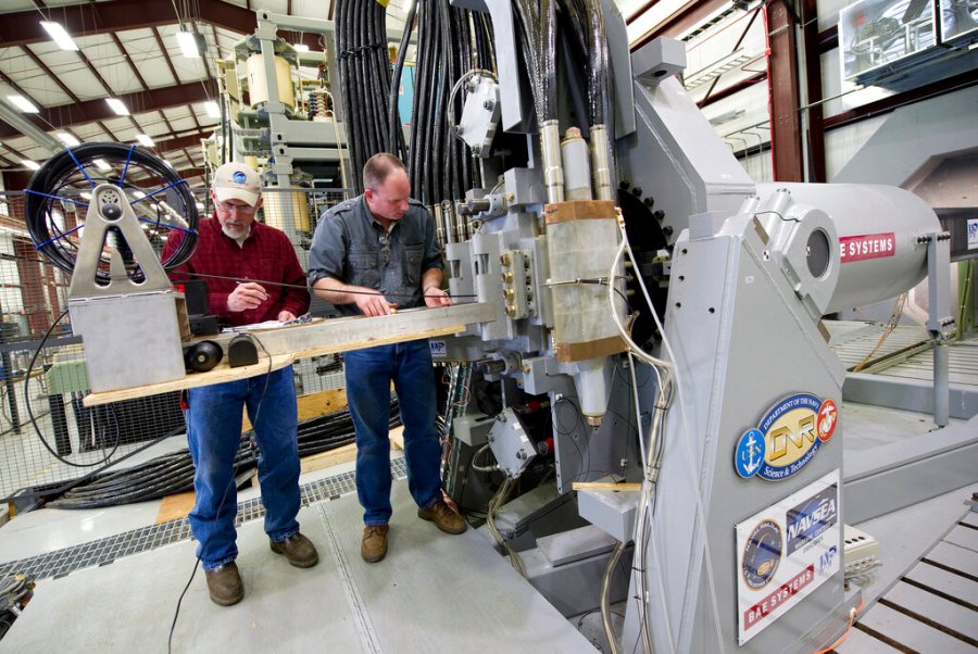 FILE – In this Thursday, Feb. 23, 2012, file photo provided by the U.S. Navy, Gary Bass, left, and Jim Poyner, from the Naval Surface Warfare Center, Dahlgren Division, take measurements after a successful test firing of an electromagnetic railgun prototype launcher at a test facility in Dahlgren, Va. The U.S. Navy pulled the plug, for now, on a futuristic weapon that fires projectiles at up to seven times the speed of sound using electricity. The Navy spent more than a decade developing the electromagnetic railgun and once considered putting them on the stealthy new Zumwalt-class destroyers built at Maine’s Bath Iron Works. (U.S. Navy photo by John F. Williams via AP, File)