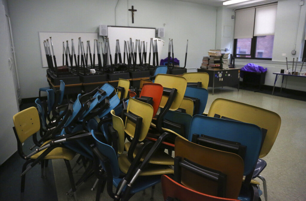 FILE – In this Thursday, Aug. 6, 2020 file photo, desks and chairs are stacked in an empty classroom after the permanent closure of Queen of the Rosary Catholic Academy in Brooklyn borough of New York. On Monday, Feb. 8, 202, Catholic education officials reported that enrollment in Roman Catholic schools in the United States dropped 6.4% from the previous academic year amid the pandemic and economic stresses — the largest single-year decline in at least five decades. (AP Photo/Jessie Wardarski)