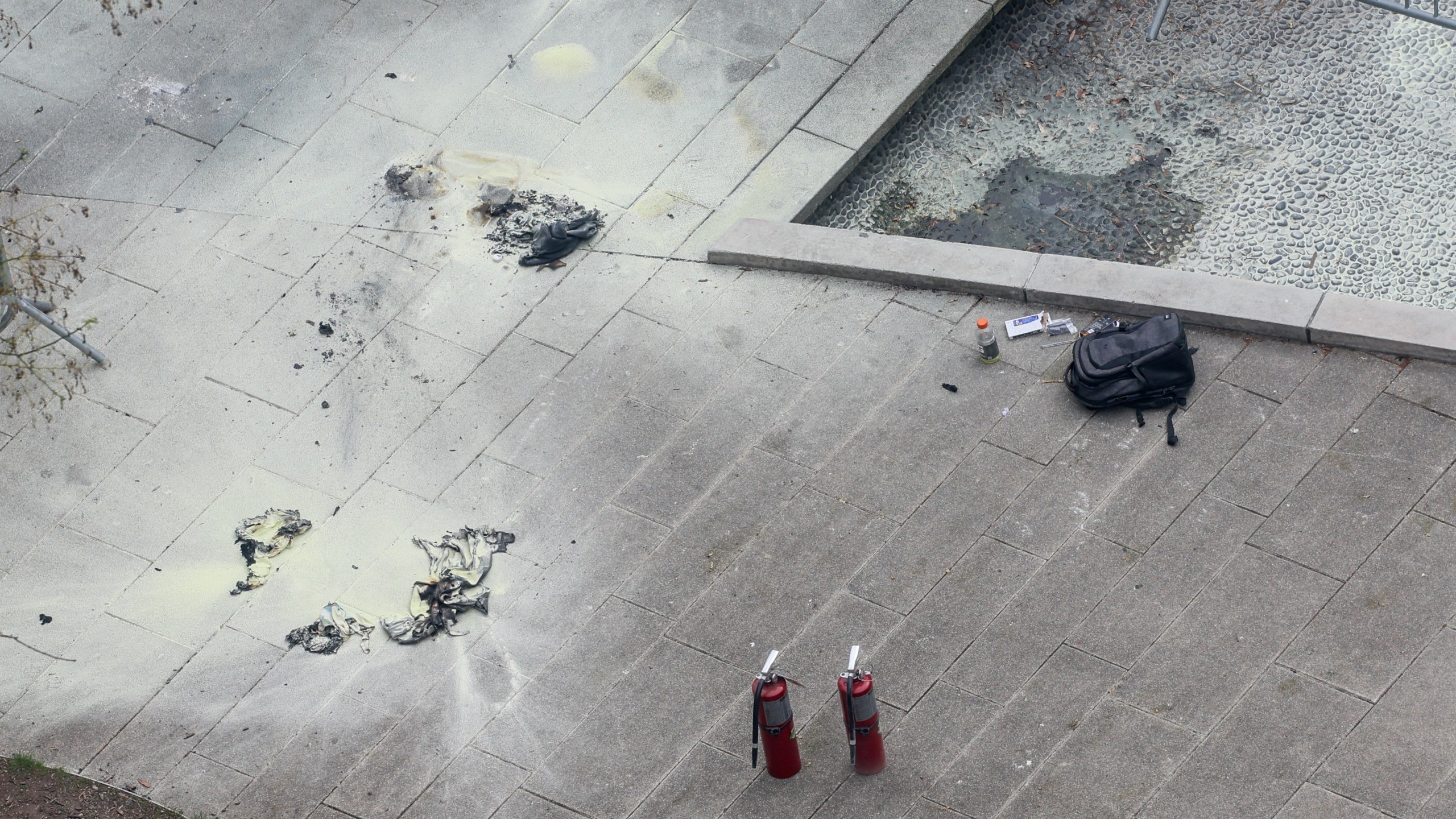 Fire extinguishers and a backpack are seen, at the scene where a person was covered in flames outside the courthouse where former U.S. President Donald Trump’s criminal hush money trial is underway, in New York, U.S., April 19, 2024. (REUTERS/Brendan McDermid)