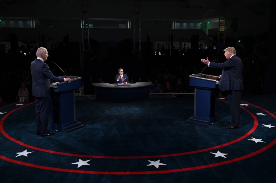 U.S. President Donald Trump (R) and Democratic presidential nominee Joe Biden participate in the first presidential debate at the Health Education Campus of Case Western Reserve University on September 29, 2020 in Cleveland, Ohio. This is the first of three planned debates between the two candidates in the lead up to the election on November 3. (Photo by Olivier Douliery-Pool/Getty Images)