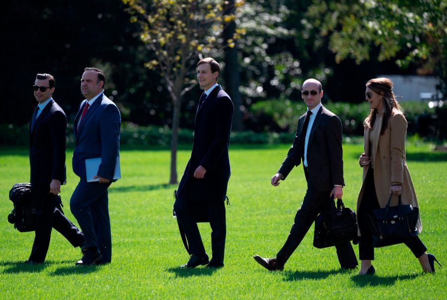 (L-R) Assistant to the President and Director of Oval Office Operations Nicholas Luna, Assistant to the President and Deputy Chief of Staff for Communications Dan Scavino, Senior Advisor to the President of the United States Jared Kushner, Senior Advisor to the President Stephen Miller, and counselor to President Hope Hicks walk to Marine One to depart from the South Lawn of the White House in Washington, DC on September 30, 2020. (Photo by ANDREW CABALLERO-REYNOLDS/AFP via Getty Images)