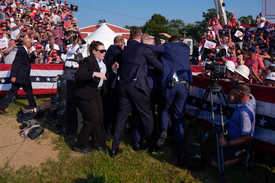 Republican presidential candidate former President Donald Trump is surrounded by U.S. Secret Service agents at a campaign rally, Saturday, July 13, 2024, in Butler, Pa. (AP Photo/Evan Vucci)