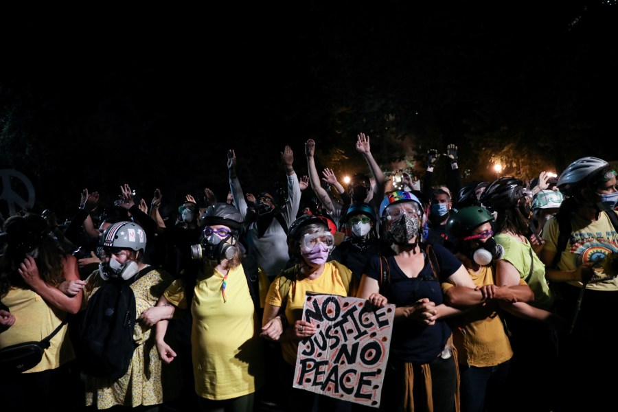 Video posted online also showed protesters taking down fencing that had surrounded the courthouse. “Dozens of people with shields, helmets, gas masks, umbrellas, bats, and hockey sticks approached the doors” before federal law enforcement came out and dispersed the crowd,” police said.