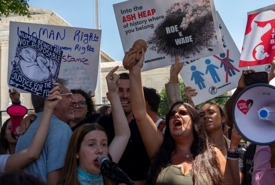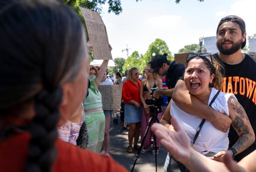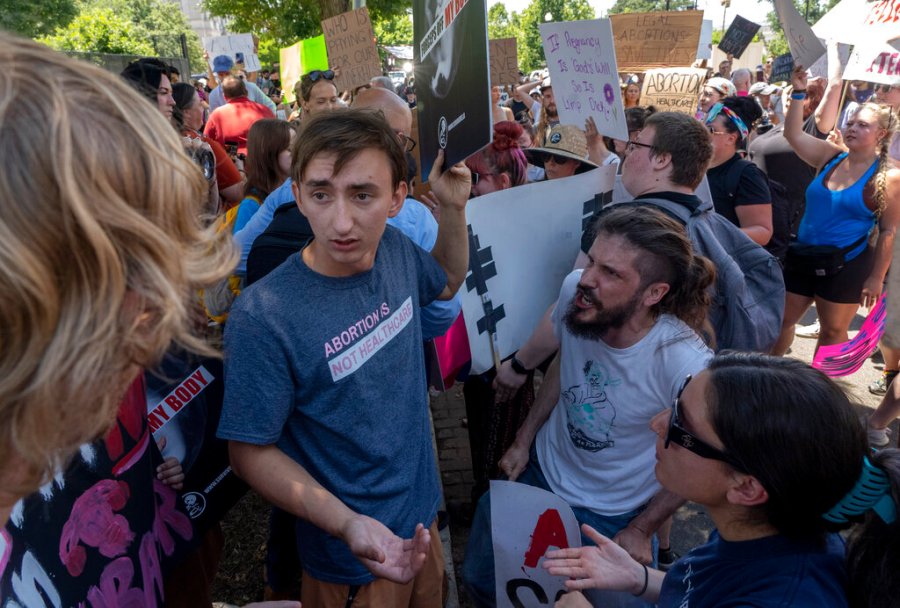 The crowd featured both abortion opponents wearing T-shirts reading “I am the Pro-Life Generation” and abortion rights supporters chanting “my body, my choice,” with both sides showing strong emotions on the decision.