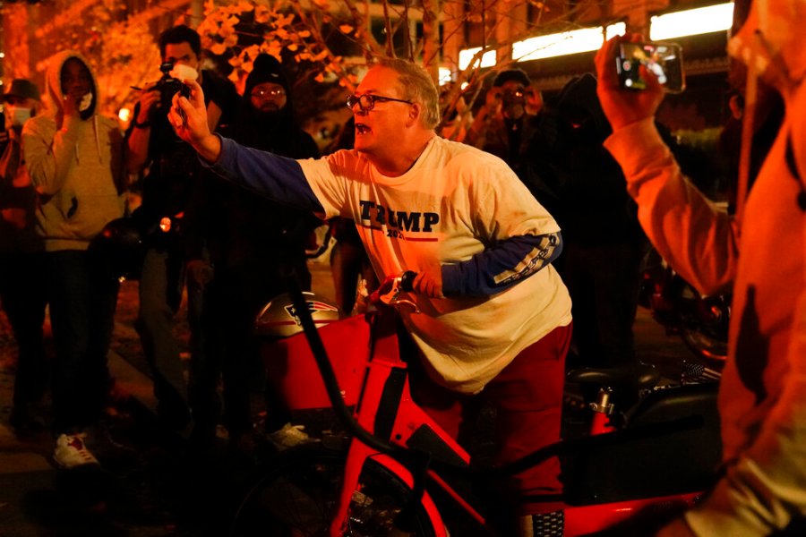 A man in a white shirt getting liquid thrown at him, is escorted away by police from protesters near BLM plaza in Washington, DC, U.S. November 14, 2020. REUTERS/Leah Millis