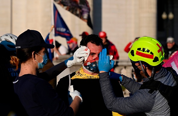 An injured supporter of US President Donald Trump is helped after being assaulted by an unknown assailant in Washington, DC, during a rally on November 14, 2020. (Photo by Andrew CABALLERO-REYNOLDS / AFP) (Photo by ANDREW CABALLERO-REYNOLDS/AFP via Getty Images)
