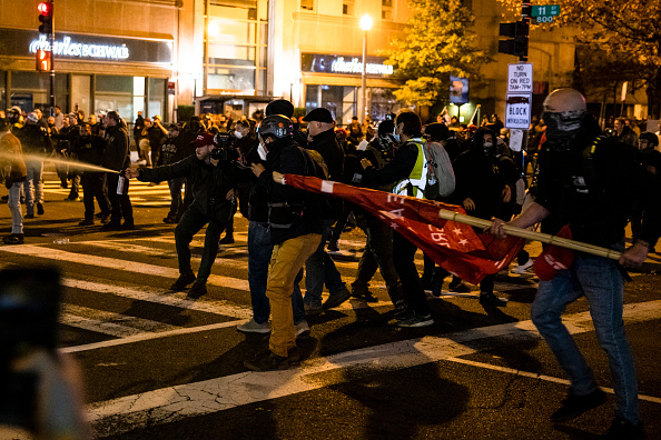 WASHINGTON, DC – NOVEMBER 14: Members of Antifa and Proud Boys clash in the middle of the street following the “Million MAGA March” on November 14, 2020 in Washington, DC. Various pro-Trump groups gathered in DC today for the “Million MAGA March” to protest the results of the 2020 presidential election. (Photo by Samuel Corum/Getty Images)