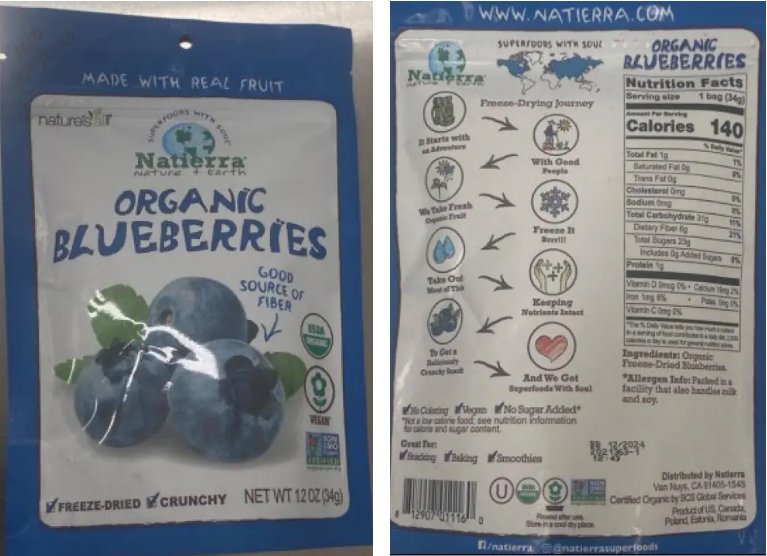 The FDA said the recall announced by BrandStorm Inc. involves Natierra Organic Freeze-Dried Blueberries, which were sold in the United States through retail and online stores.