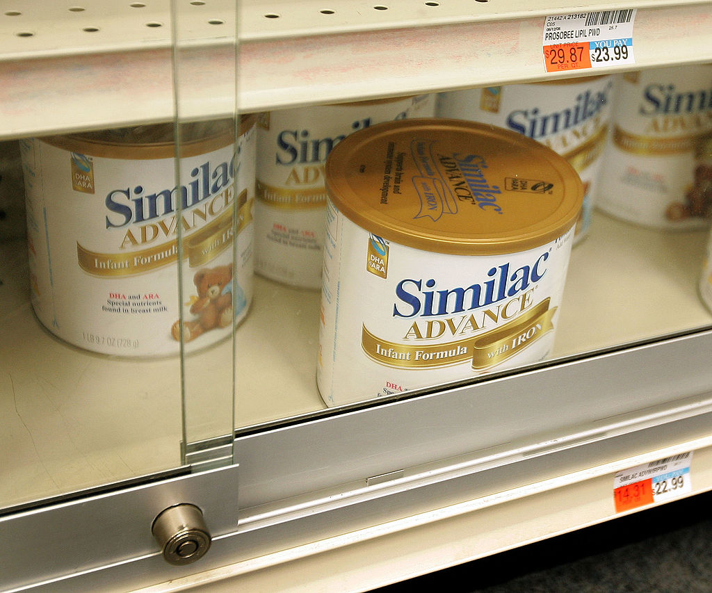 CHICAGO – JUNE 07: Cans of powdered baby formula are seen locked behind glass on shelves at a pharmacy June 7, 2005 in Chicago, Illinois. Due to the possible theft of powered baby formula, some retail stores are securing the product behind glass or referring customers to the store’s service desk or workers for assistance. (Photo by Tim Boyle/Getty Images)