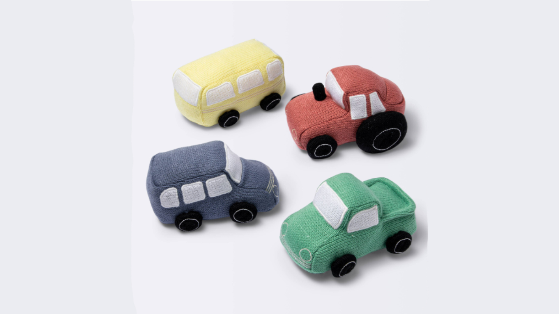 The vehicles are soft and knitted in construction. The sets include a blue car, a yellow bus, a red tractor and a green truck, each with a rattle inside. The CPSC said the vehicles are about 3 inches tall, 3.5 inches wide, and 6 inches long. Item number 030-02-1042 is printed on the fabric tag attached to each vehicle’s bottom.