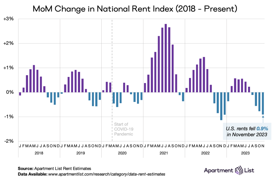 Rents fluctuate up and down, depending on the season, but November is usually when rents fall the fastest, Apartment List analysts say. Vacancies are the hardest to fill during the winter holiday months, so now is the time when renters should negotiate, analysts encourage.