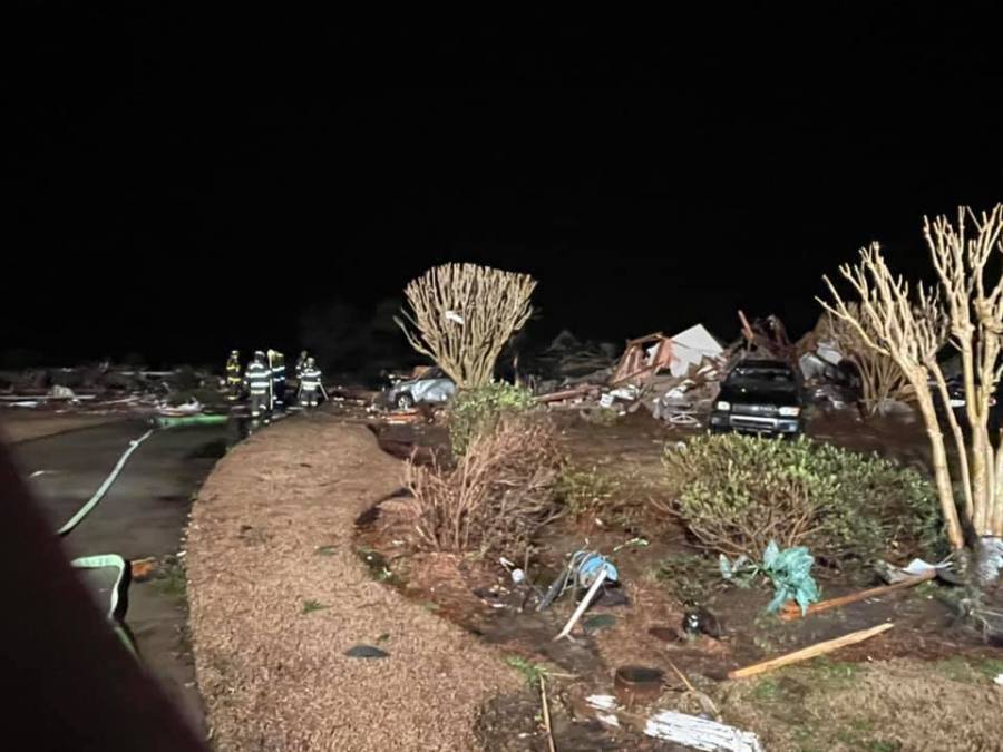 Photos distributed by the sheriff’s office showed first responders walking through a debris field of uprooted trees and crumpled piles of boards and bricks in the golf course community.