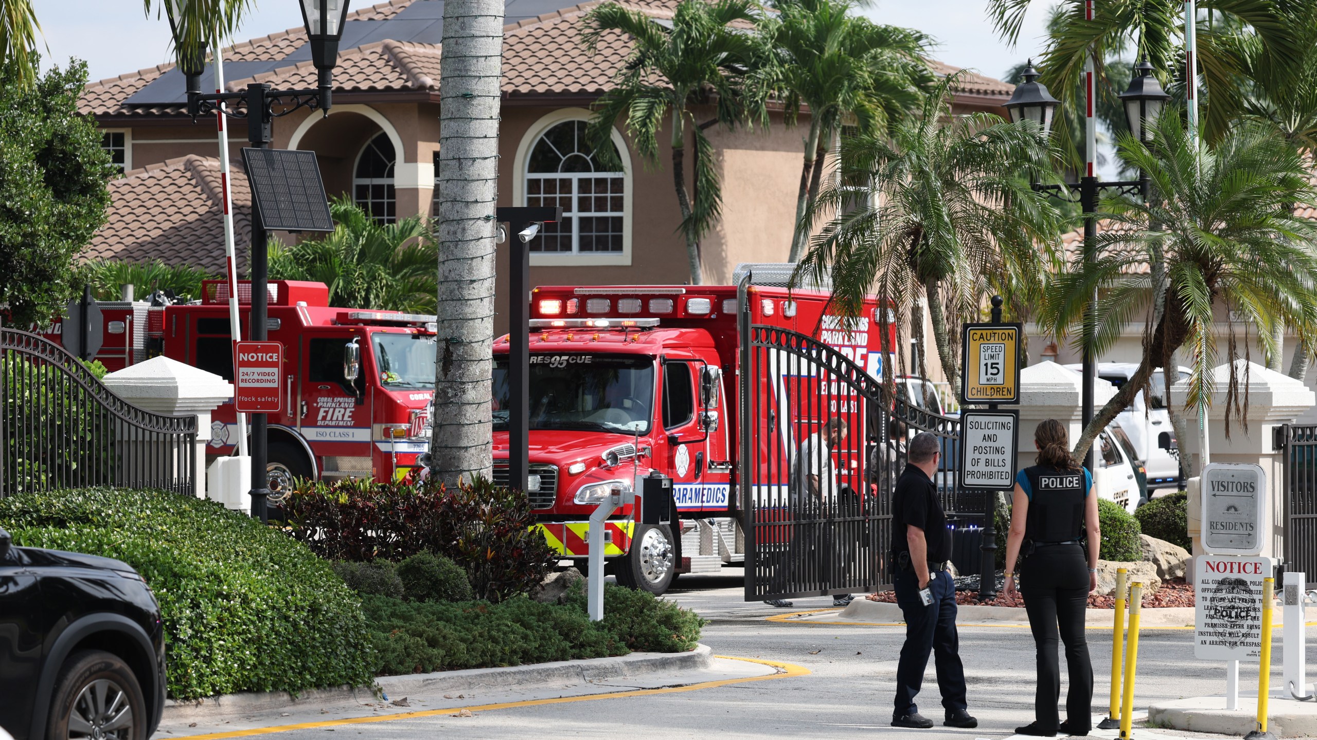 Emergency personnel from Coral Springs and Coconut Creek are on scene where a plane crashed in the Windsor Bay community in Coral Springs on Nov. 10, 2025. (Carline Jean/South Florida Sun-Sentinel via AP)