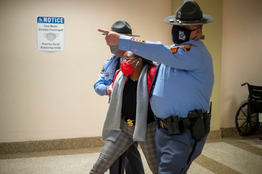 Cannon had another run-in with officers in February. She and others held a two-hour sit-in on a Capitol stairway after Cannon said it was improper that a police officer led her away while Democrats were protesting voting bills. Cannon put her ear up to the bullhorn of an officer ordering protesters to disperse and then demanded an apology from another officer who moved her away.