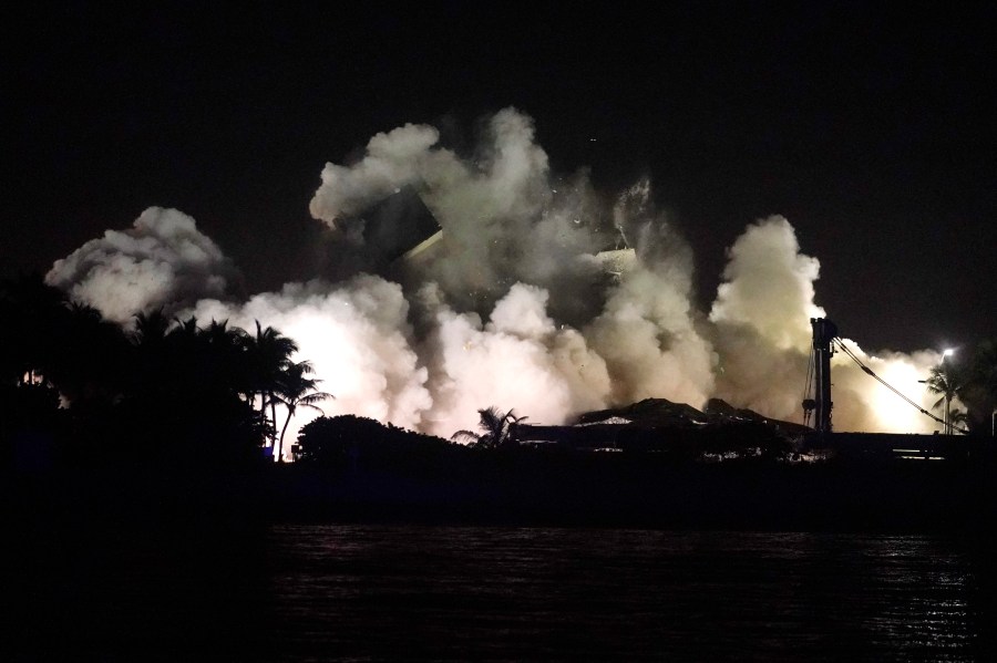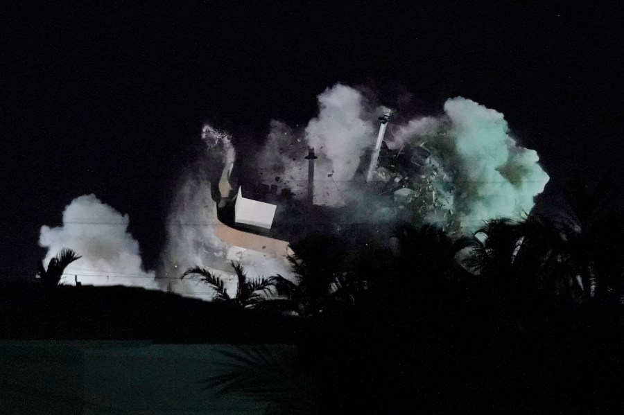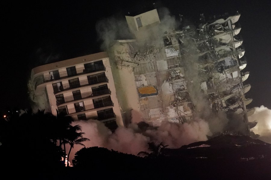 Demolition teams bring down the unstable remainder of the Champlain Towers South condo building, late Sunday, July 4, 2021, in Surfside, Fla. The work to demolish the remains had suspended the search-and-rescue mission, but officials said Sunday it should eventually open up new areas for rescue teams to explore. (AP Photo/Wilfredo Lee)