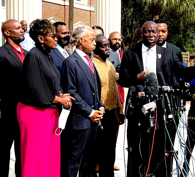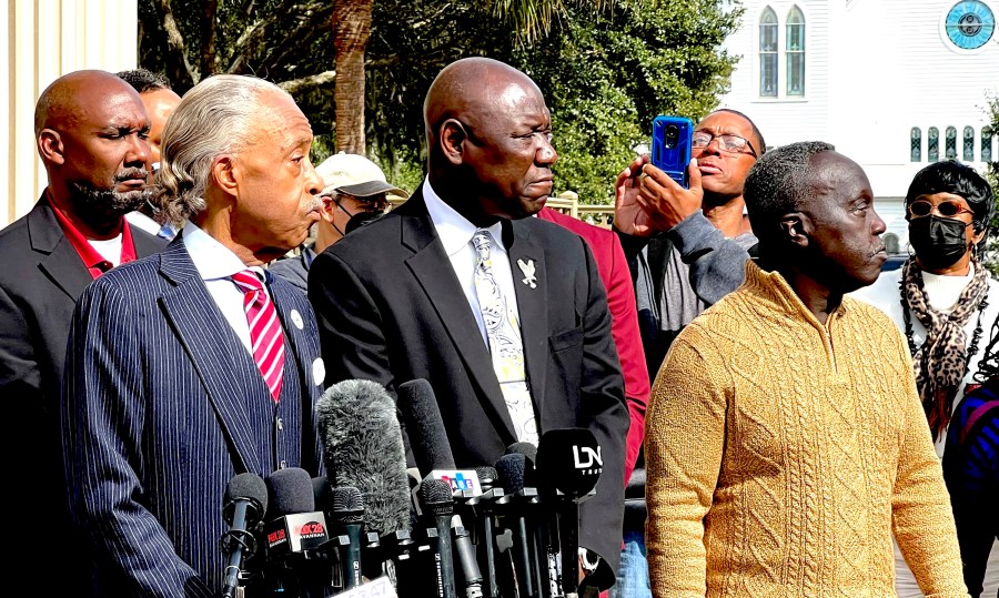 The Rev. Al Sharpton spoke with reporters Wednesday outside the Glynn County courthouse, where he held the hands of Arbery’s parents while leading a prayer for justice. Sharpton criticized the disproportionately white makeup of the jury.