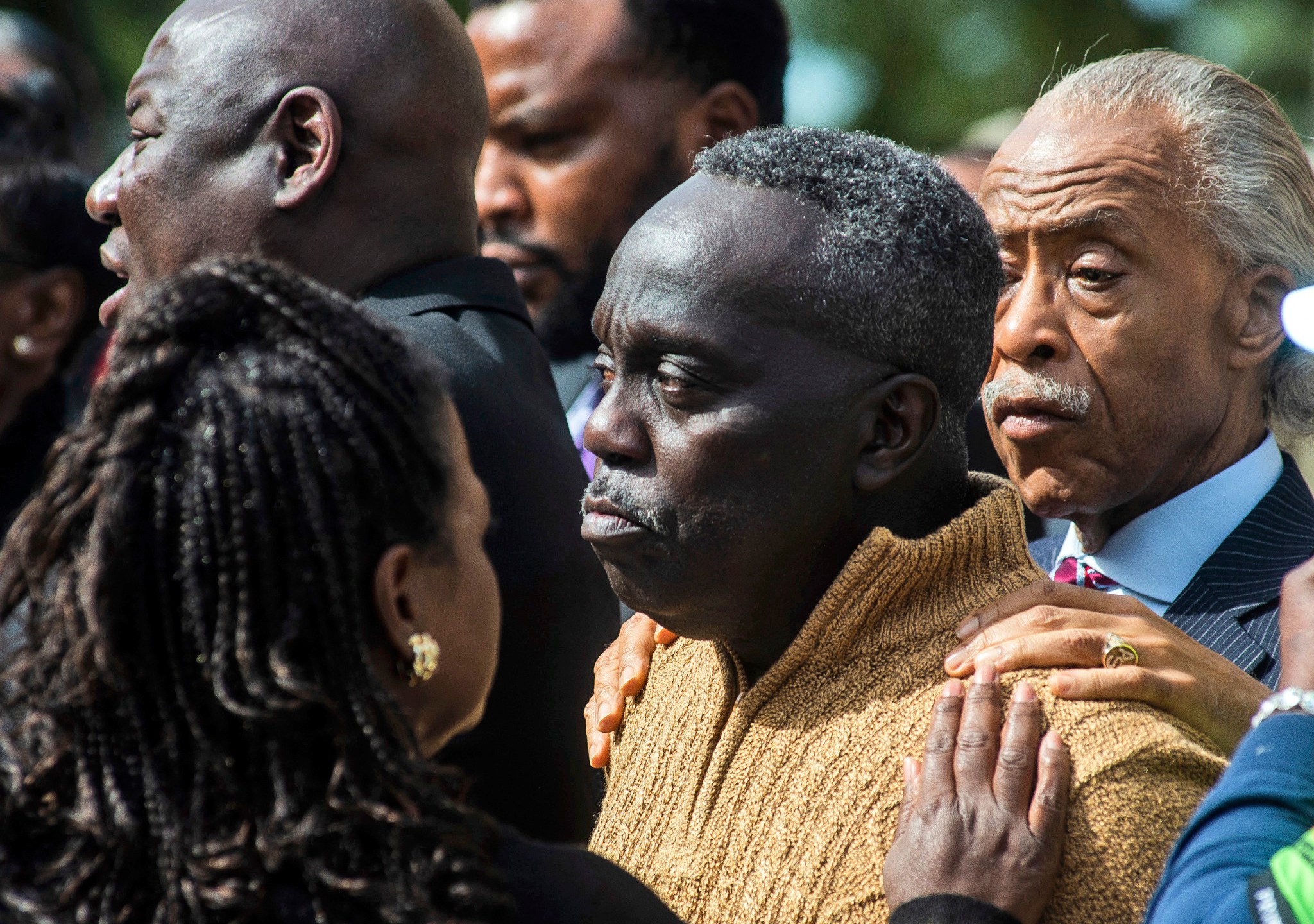 Rev. Al Sharpton, right, and Barbara Arnwine, founder of the Transformative Justice Coalition, rest their hands on Marcus Arbery’s shoulder as Benjamin Crump, left, one of the Arbery family’s lawyers, speaks about the slain Ahmaud Arbery outside the Glynn County courthouse, Wednesday, Nov. 10, 2021, in Brunswick, Ga. Rev. Sharpton led a prayer and spoke out against injustice during the noon break in the trial of three men charged with murder in Ahmaud Abery’s shooting death. (Terry Dickson/The Brunswick News via AP)