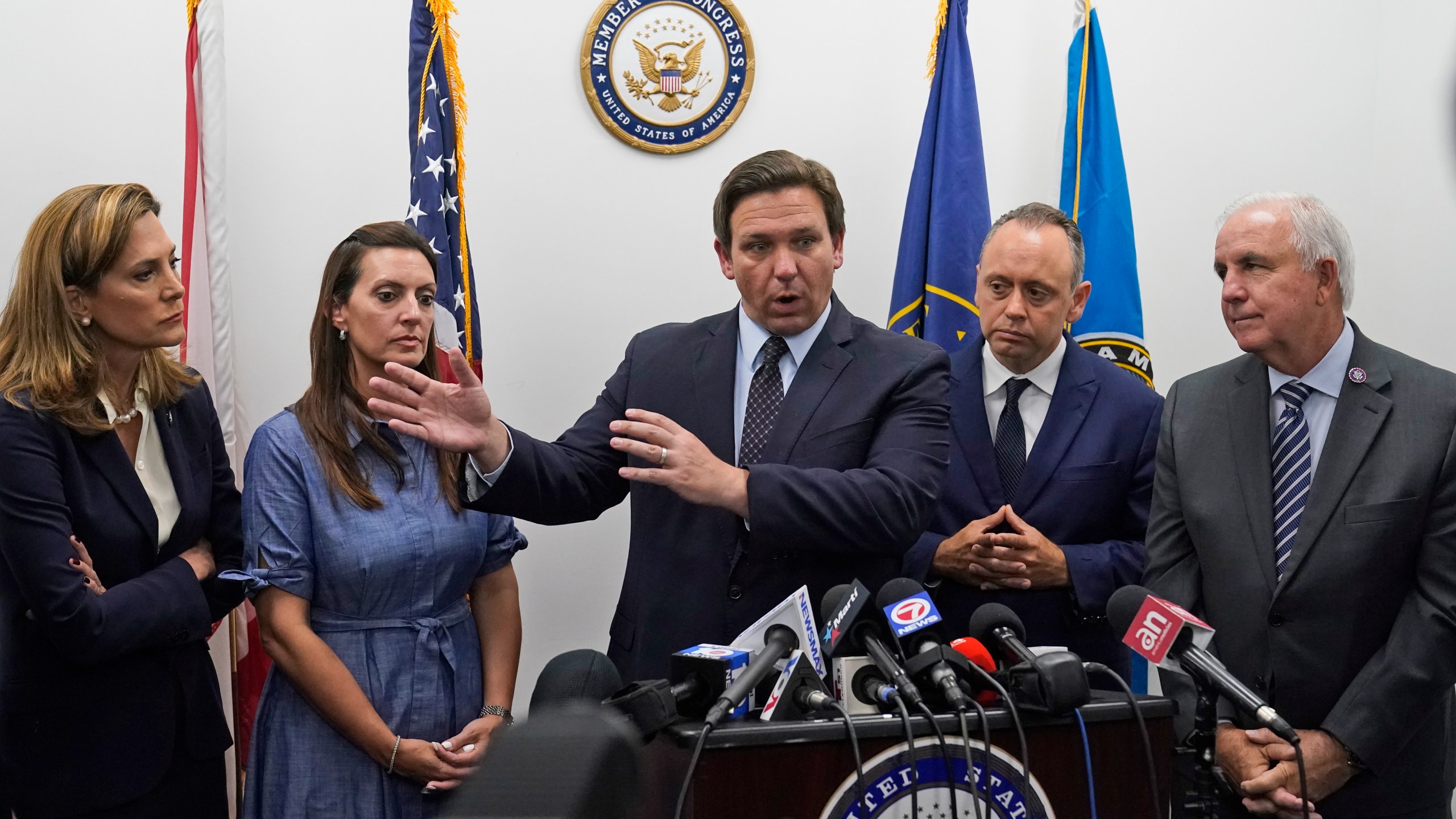 Florida Gov. Ron DeSantis, center, speaks during a news conference at the offices of Rep. Maria Elvira Salazar, left, R-Fla., along with Lt. Gov. Jeanette Nunez, second from left, Marcell Felipe, second from right, founder of the Inspire America Foundation, an organization dedicated to promoting democracy in Cuba and the Americas, and Rep. Carlos Gimenez, R-Fla., Thursday, July 15, 2021, in Miami. DeSantis and other officials pressed the White House on Thursday to support efforts to preserve internet service to antigovernment protesters in Cuba, even advocating the use of giant balloons as floating Wi-Fi hotspots to allow images of dissent to stream unabated from the authoritarian nation. (AP Photo/Wilfredo Lee)
