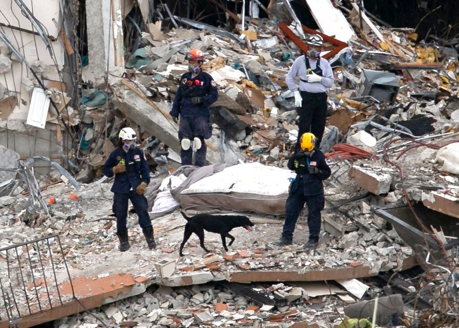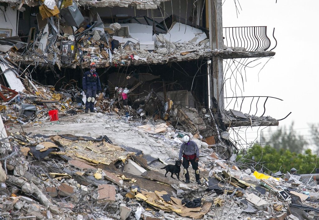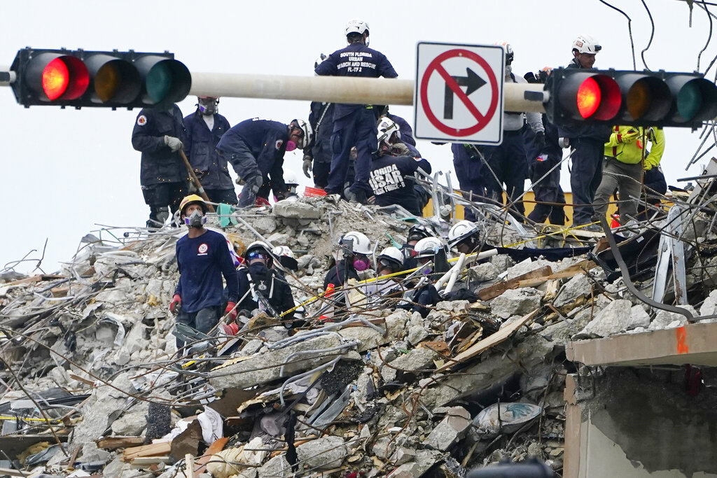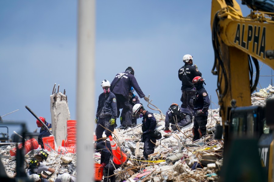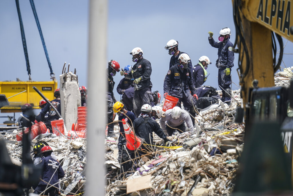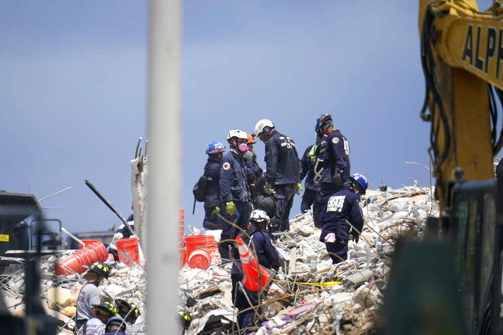 Miami-Dade Fire Rescue Chief Alan Cominsky said first responders have moved nearly three million pounds of concrete and are using sonar and video equipment to search for any signs of life in the rubble.