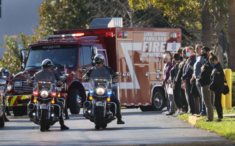 After the shootings Tuesday, police motorcycles with their lights flashing escorted a fire rescue truck as it brought the body of one of the agents to the medical examiner’s office in nearby Dania Beach. Law enforcement officials from numerous agencies lined up to pay their respects as a flag-covered body was removed from the vehicle and taken inside.