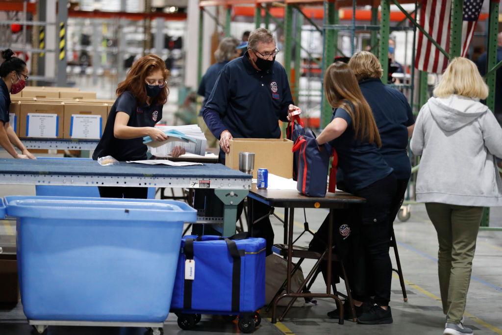 LARGO, FL – NOVEMBER 03: Workers at the Pinellas County Supervisor of Elections Office process voters’ ballots inside of the Elections Service Center Operations Department on November 3, 2020 in Largo, Florida. After a record-breaking early voting turnout, Americans head to the polls on the last day to cast their vote for incumbent U.S. President Donald Trump or Democratic nominee Joe Biden in the 2020 presidential election. (Photo by Octavio Jones/Getty Images)