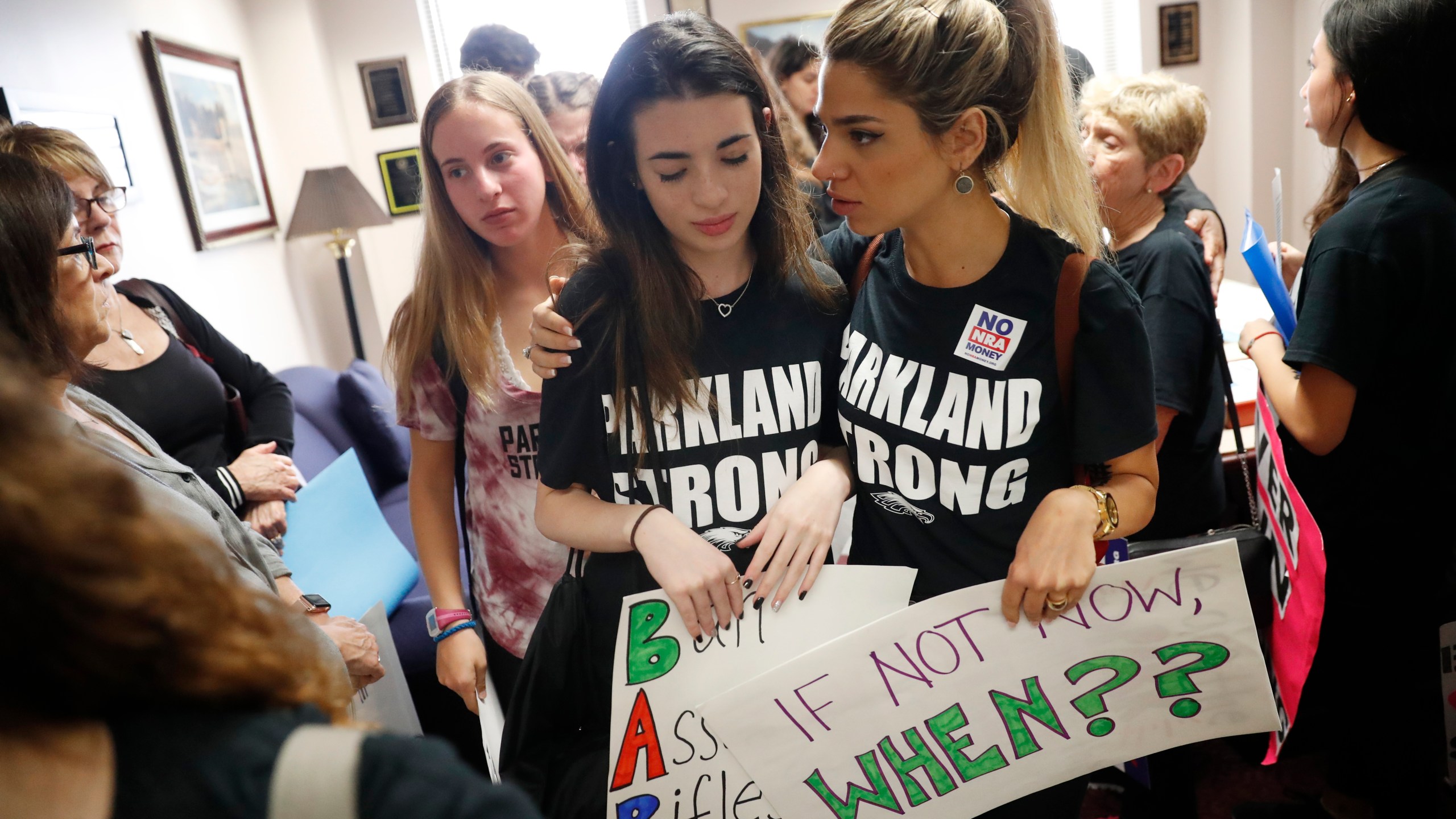 FILE- In this Feb. 21, 2018 file photo, Lital Donner, youth director for Congregation Kol Tikvah, comforts Aria Siccone, 14, a student survivor from Marjory Stoneman Douglas High School, as they challenge lawmakers in the state capitol on gun control reform, in Tallahassee, Fla. Marjorie Stoneman Douglas’ Class of 2021 has endured a high school experience that will likely never be rivaled _ baptized by gunfire in their first year, bonded by hiding under desks for hours and punctuated now by another life altering event _ a global pandemic. (AP Photo/Gerald Herbert, File)