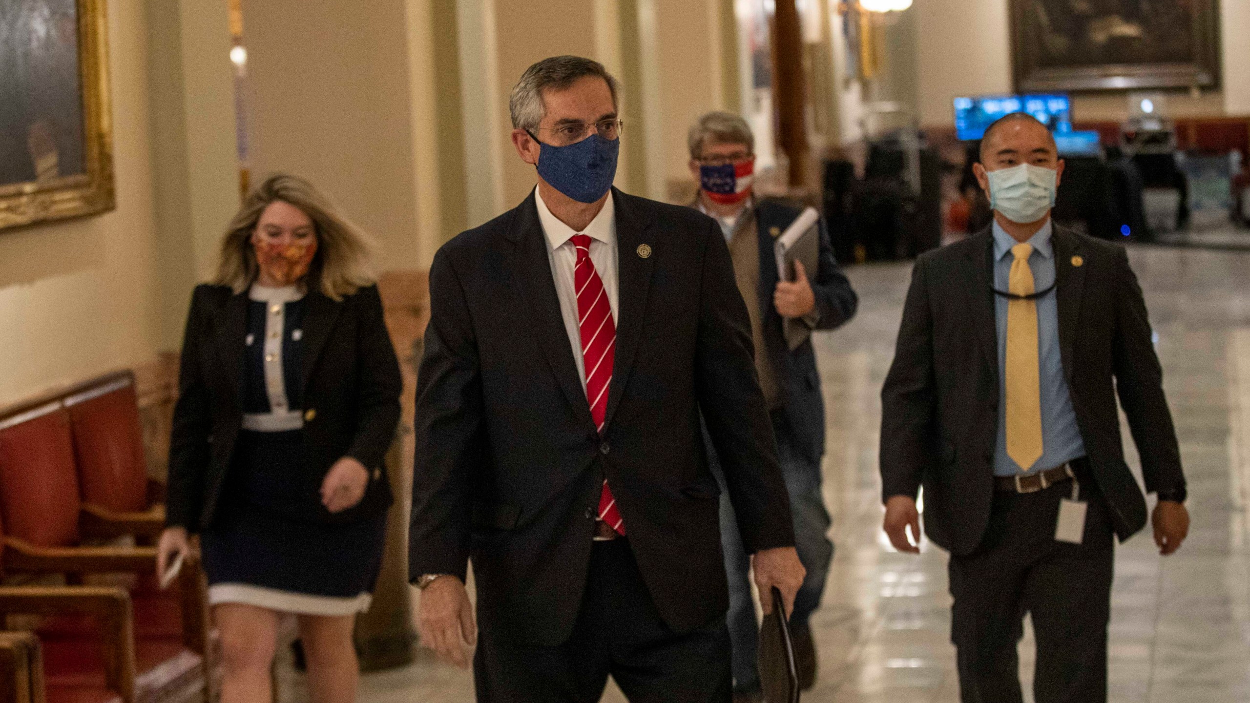 Georgia Secretary of State Brad Raffensperger, center, walks with members of his staff as they make their way to a press conference at the Georgia State Capitol building in Atlanta, Wednesday, Dec. 2, 2020. (Alyssa Pointer/Atlanta Journal-Constitution via AP)