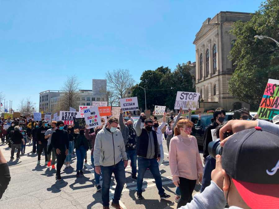 A couple hundred people gathered in a separate park in the heart of downtown Atlanta and marched together through the streets to join the larger rally, yelling slogans like “Stop Asian hate” and “We are what America looks like.”