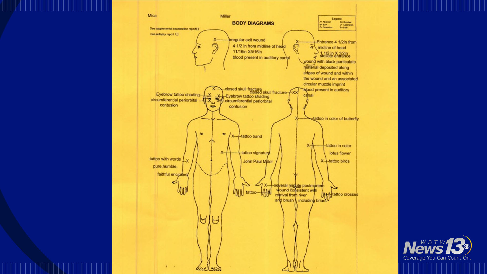 Mica also had seven tattoos — including the name “John Paul Miller” on the right side of her lower chest.