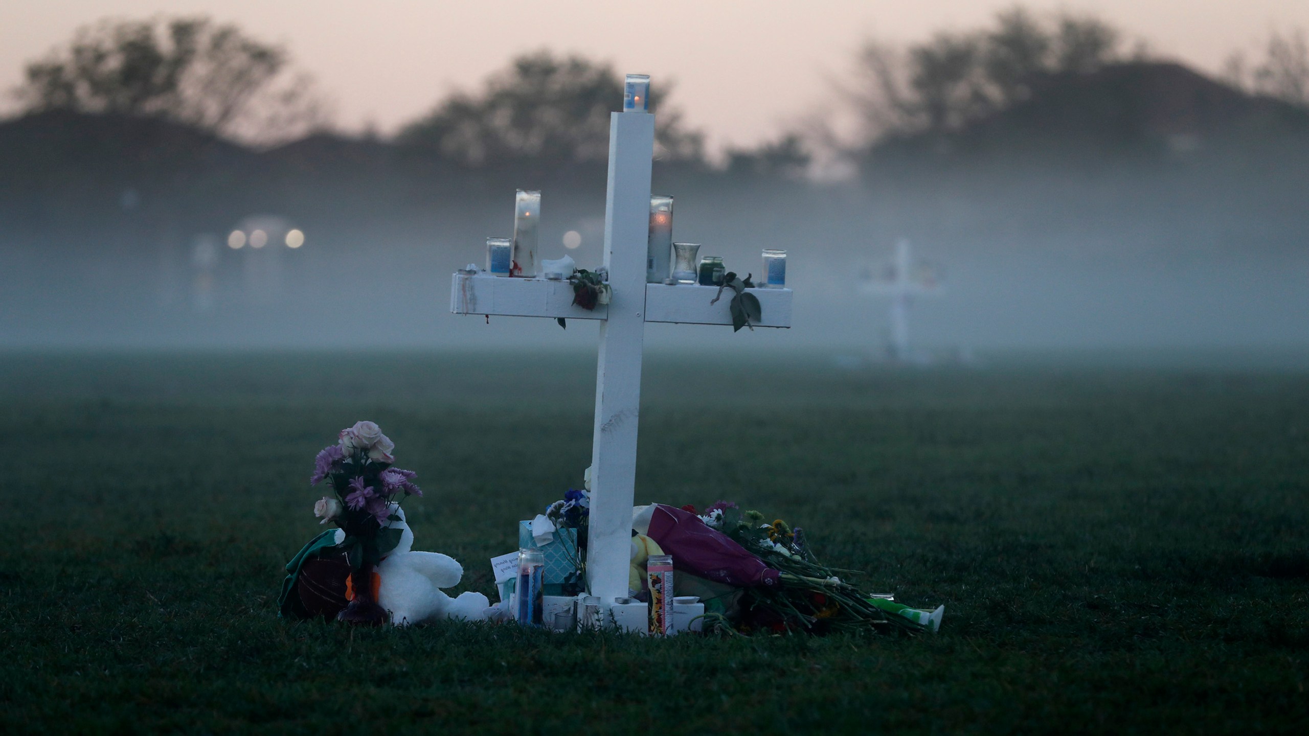 FILE – In this Feb. 17, 2018, file photo, an early morning fog rises where 17 memorial crosses were placed for the 17 students and faculty killed in the shooting at Marjory Stoneman Douglas High School in Parkland, Fla. (AP Photo/Gerald Herbert, File)