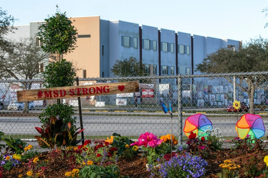 FILE – A memorial to the victims is seen outside Marjory Stoneman Douglas High School in Parkland, Fla., during the one-year anniversary of the school shooting, Thursday, Feb. 14, 2019. (Al Diaz/Miami Herald via AP, File)