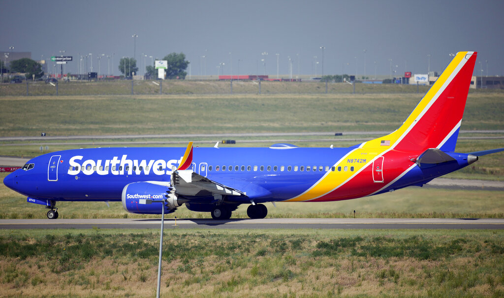 FILE – In this July 2, 2021, file photo, a Southwest Airlines jetliner taxis down a runway for take off from Denver International Airport in Denver. Southwest Airlines canceled hundreds more flights Monday, Oct. 11, 2021 following a weekend of major service disruptions. By midmorning Monday, Southwest had canceled about 360 flights and more than 600 others were delayed. (AP Photo/David Zalubowski, File)