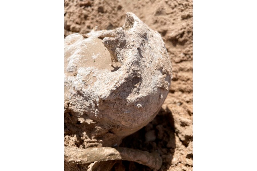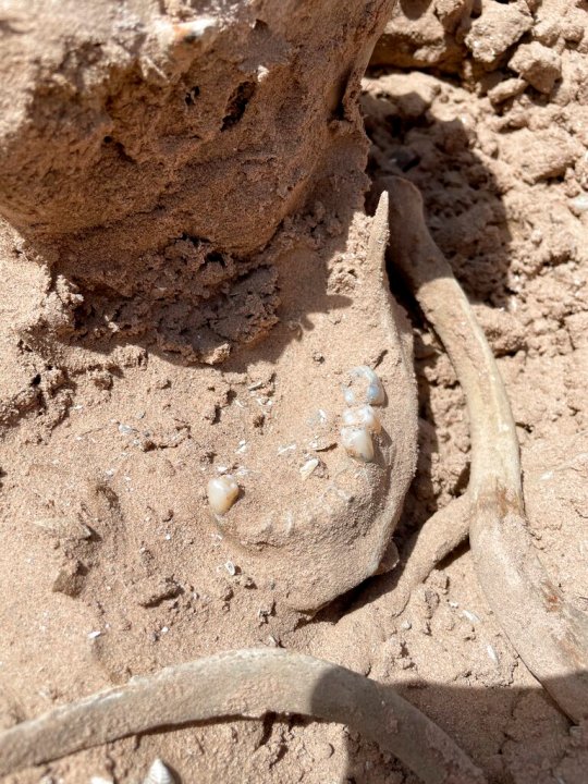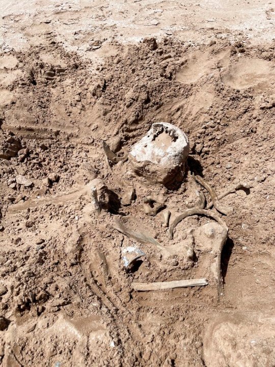 This photo of Saturday, May 7, 2022, provided by Lindsey Melvin of Henderson, Nev., shows human remains she and her sister discovered on a sandbar that recently surfaced as Lake Mead recedes. A closer look revealed a human jaw with teeth. The National Park Service confirmed in a statement that the remains are human. (Lindsey Melvin via AP)