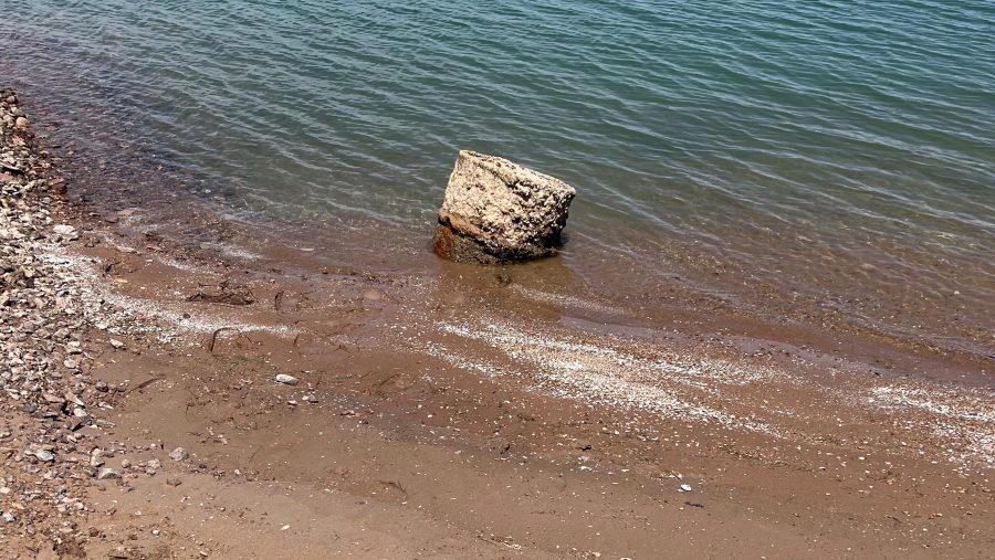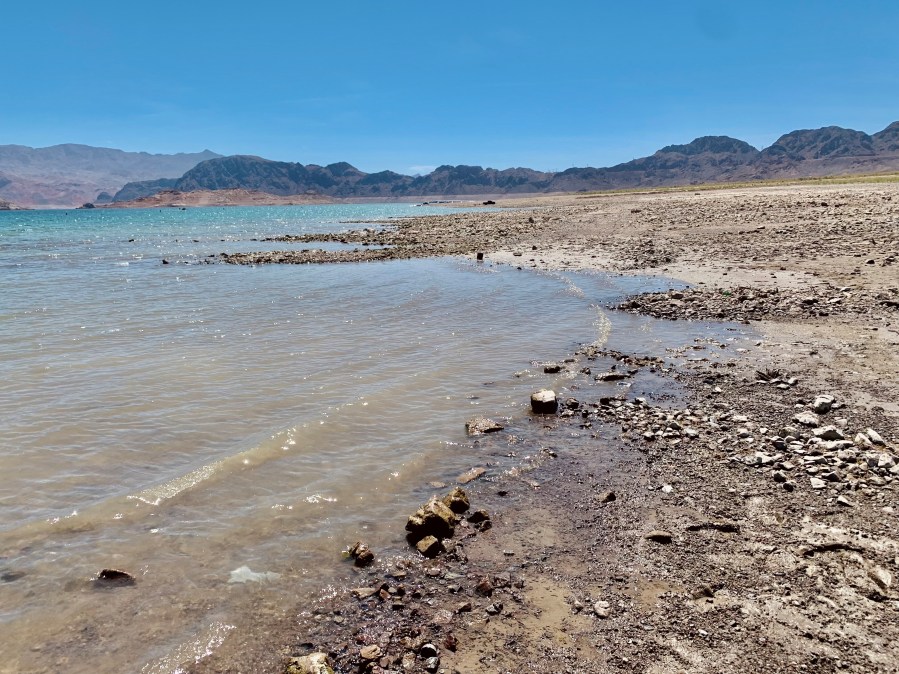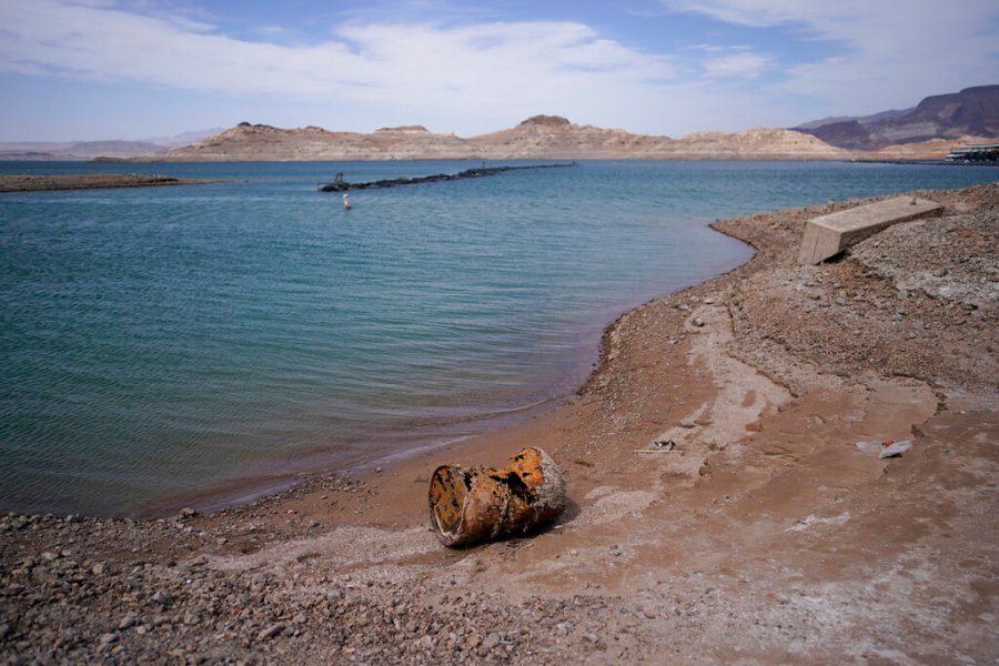 Rusting debris that used to be underwater sits above the water level on Lake Mead at the Lake Mead National Recreation Area, Monday, May 9, 2022, near Boulder City, Nev. (AP Photo/John Locher)